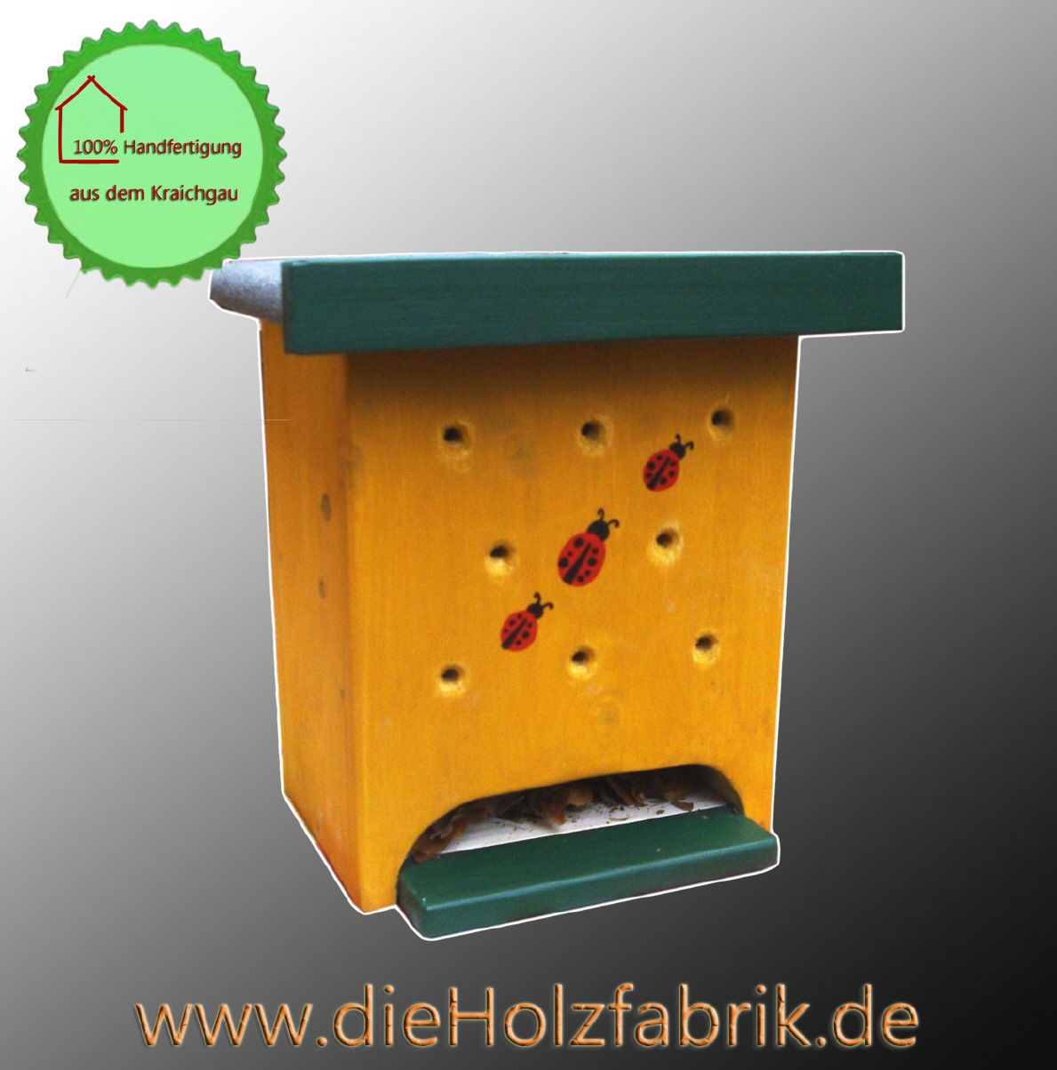 Marienkäferhäuser sind speziell für die niedlichen und nützlichen Marienkäfer konstruiert. Ein Marienkäfer frisst pro Tag bis zu 50 Blättläuse und mehrer Tausend während seines ganzen Labens. Die Häuser sind bereits mit Nistmeterial befüllt welches für Marienkäfer geeignet ist. Der Dach ist mit Dachpappe bedeckt und lässt sich zum reinigen und Befüllen nach oben aufklappen.