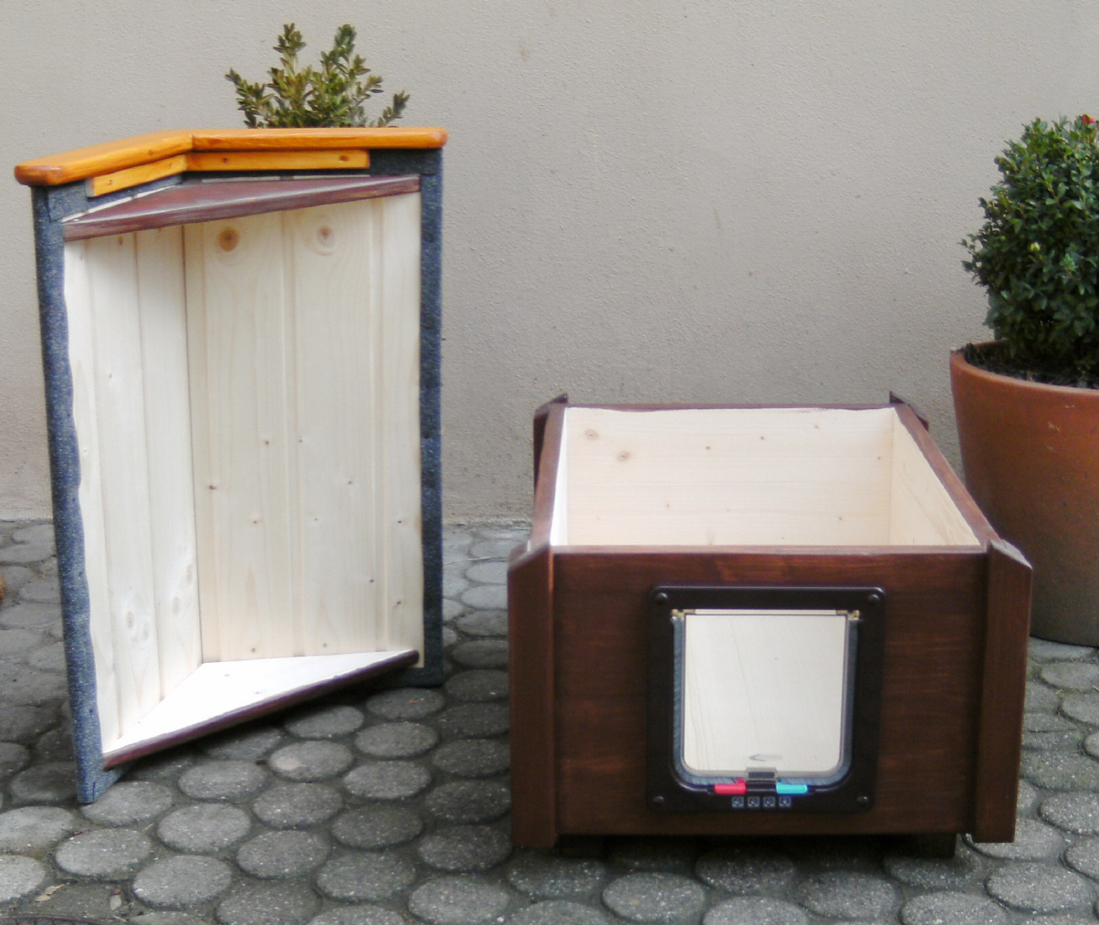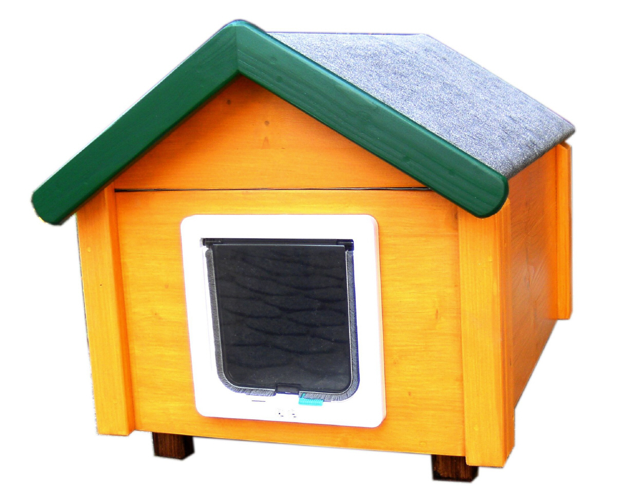 Unsere Katzenhäuser sind aus massivem Holz gearbeitet und wetterfest. Die Außenwände sind mit unschädlicher Holzschutzlasur behandelt, das Dach ist mit Bitumenbahnen gedeckt. Die Häuschen stehen auf stabilen Füßen, damit der Boden keiner Feuchtigkeit ausgesetzt ist.